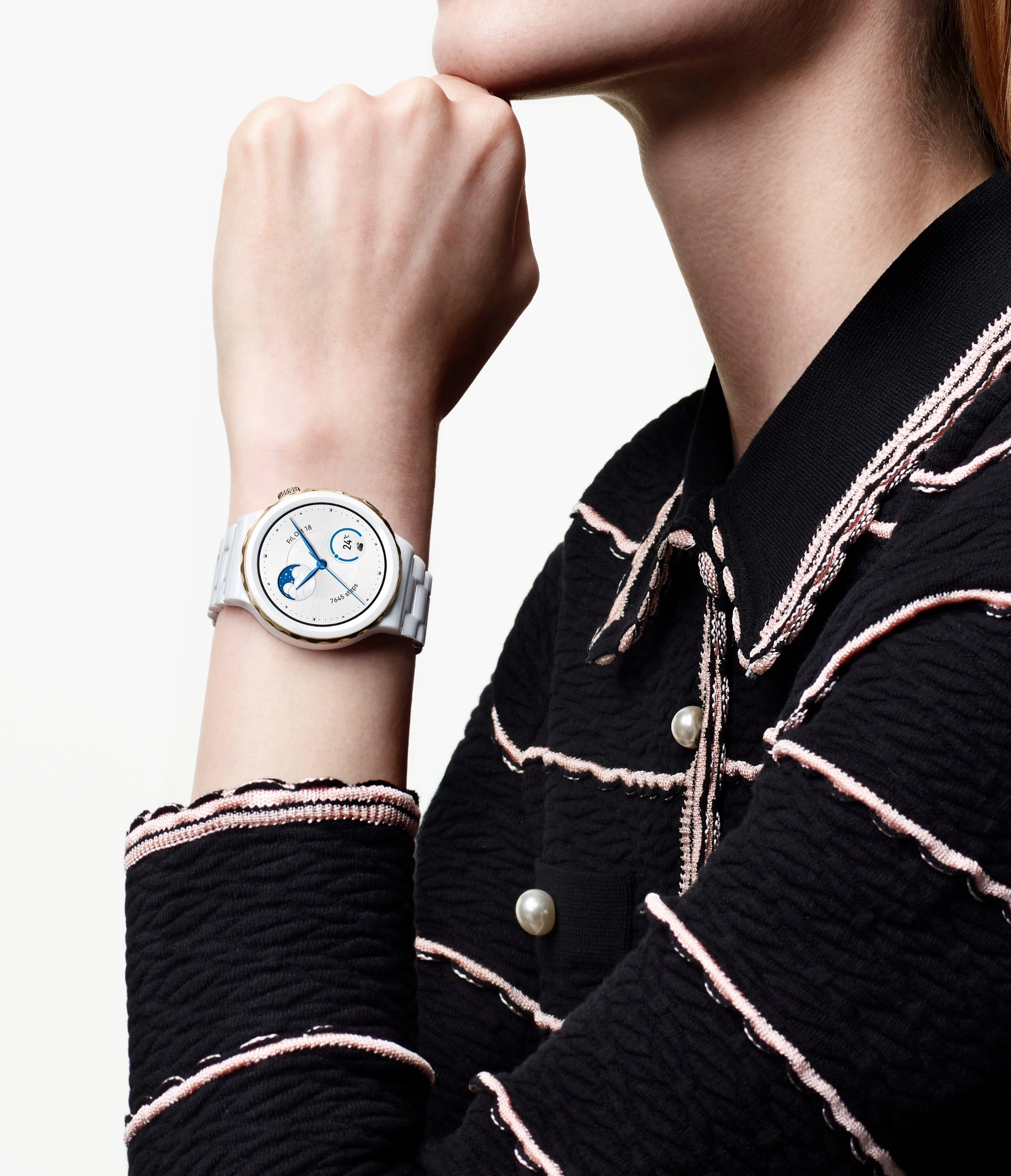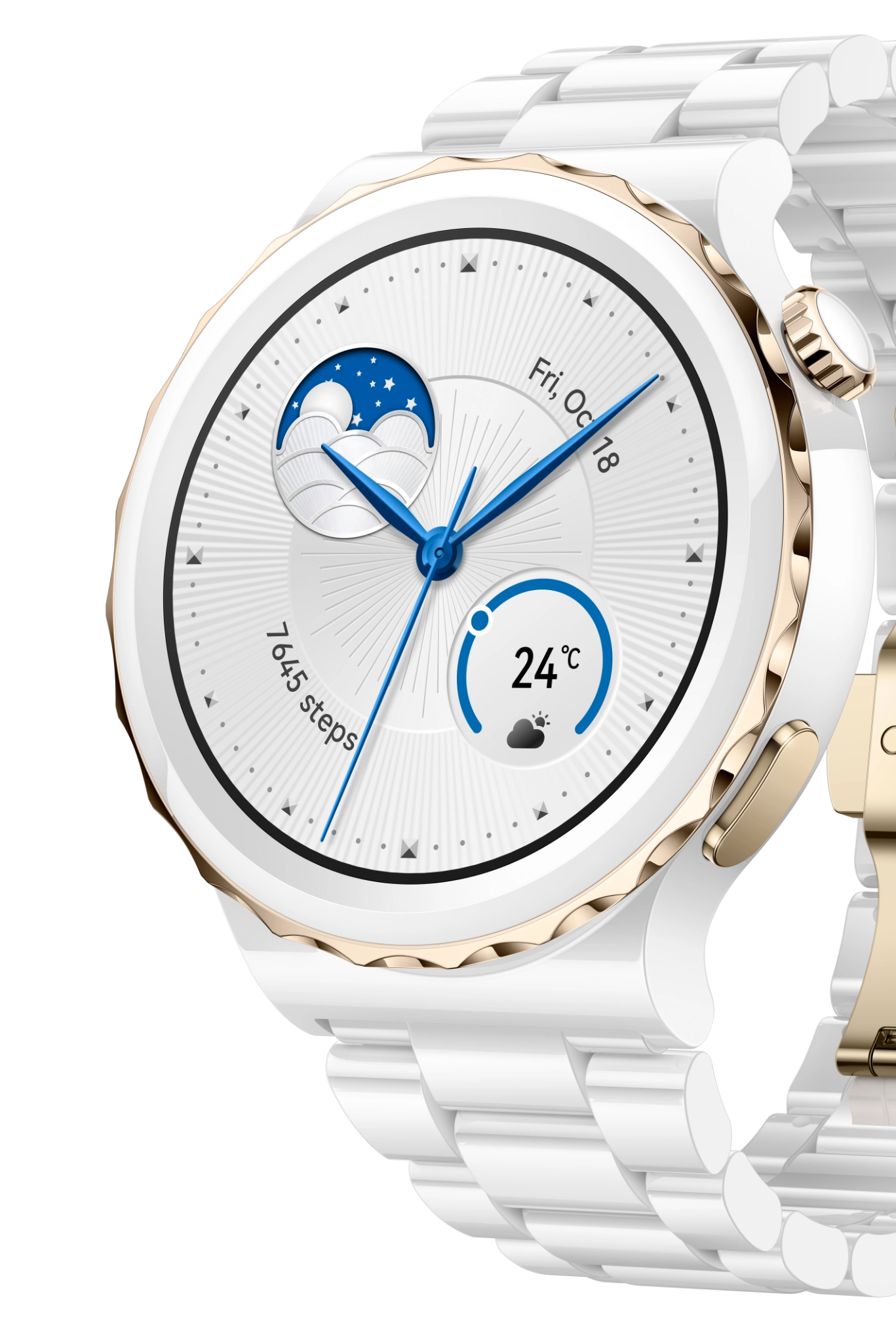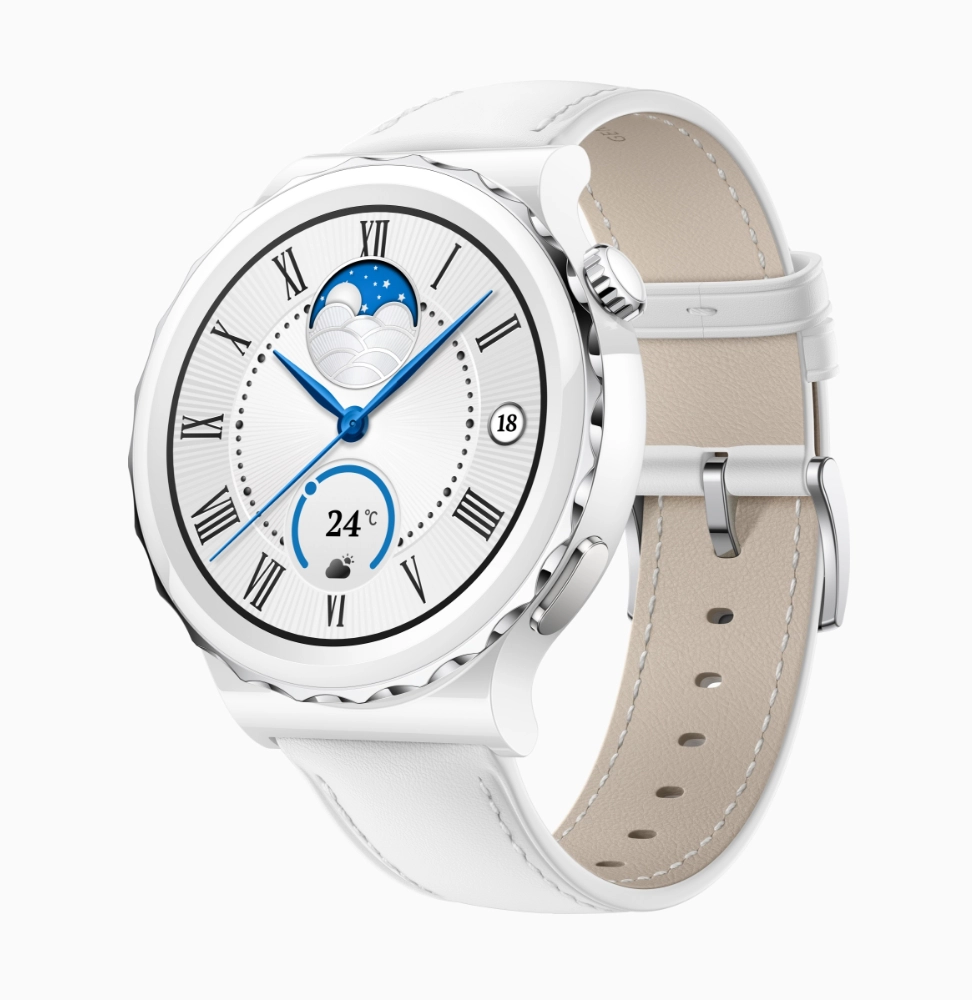 Умные часы представлены в двух версиях: с золотистым безелем и белым керамическим ремешком и с серебристым безелем и белым кожаным ремешком4 . Обе версии выглядят стильно и элегантно.