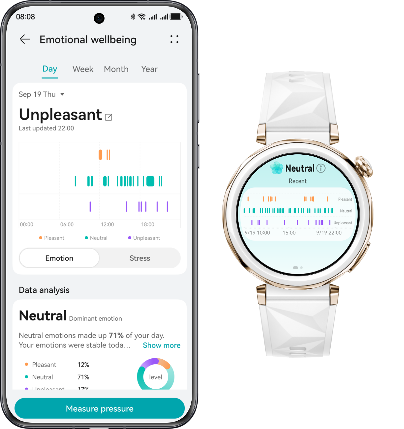 Вам также доступно отображение тенденций изменения эмоций в течение дня, недели, месяца или года. Такая информация помогает скорректировать план занятий спортом или режим дня, например время сна, чтобы обрести баланс разума, тела и духа.17