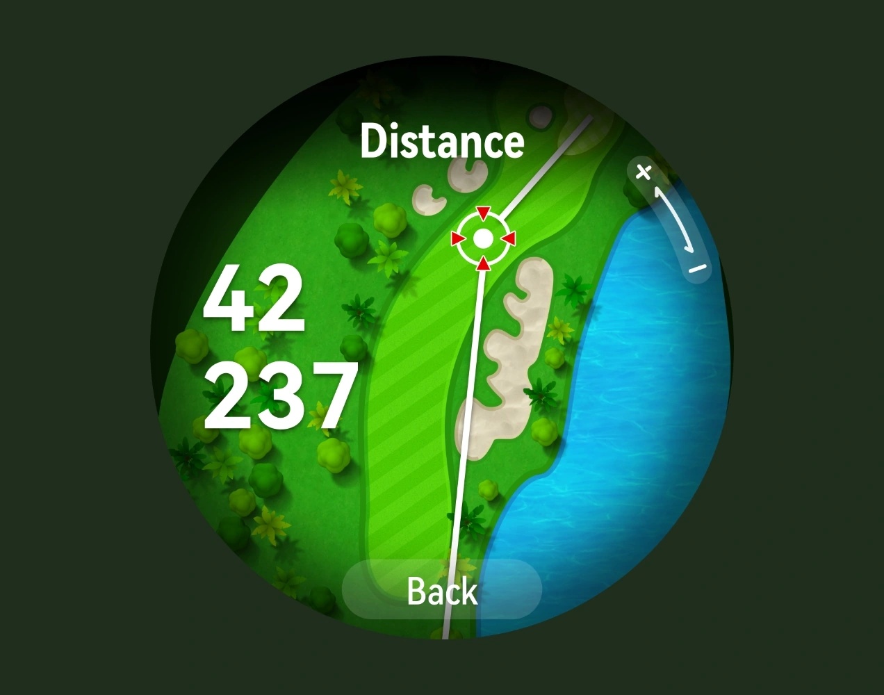 Быстрое отслеживание расстояния. Вы можете в режиме реального времени проверять расстояния до препятствий спереди, по центру и сзади грина, чтобы корректировать стратегию игры.
